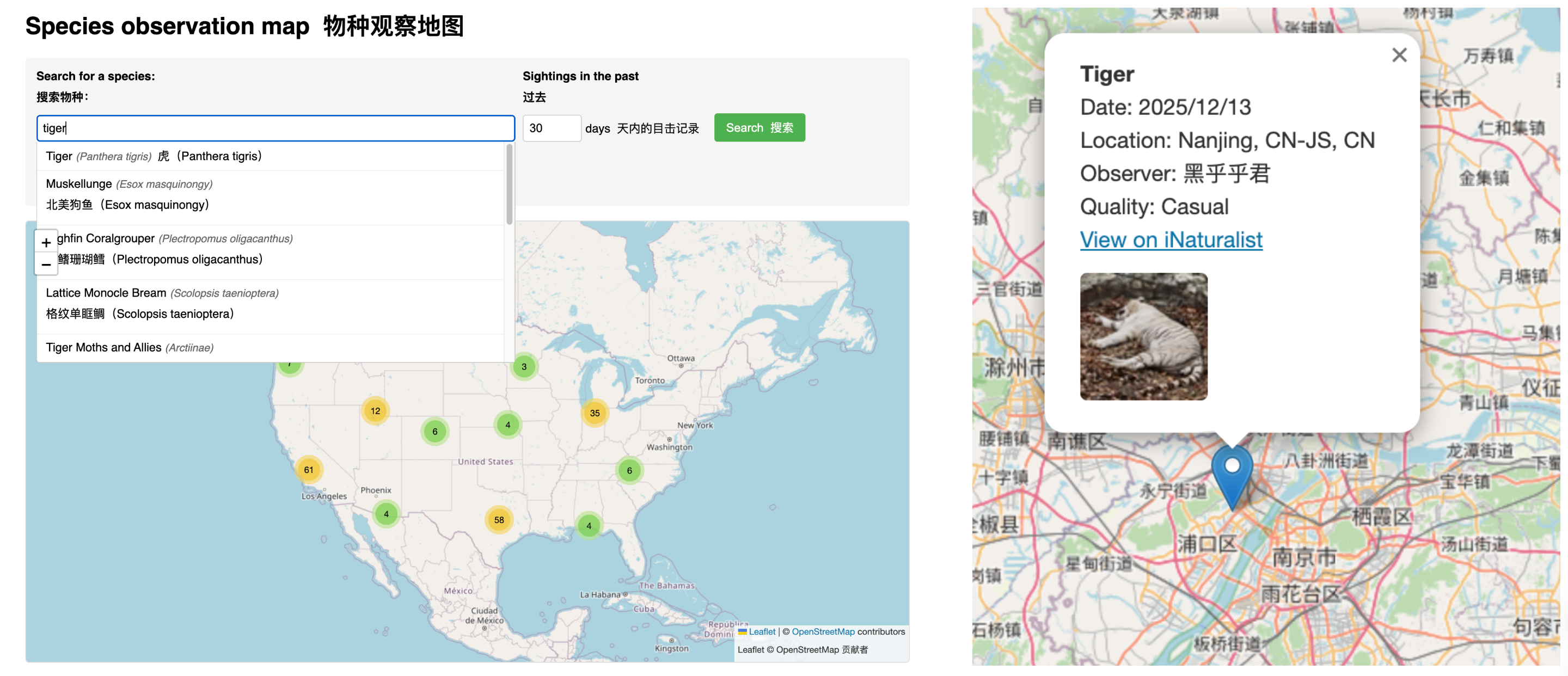 这个挺有意思的,动物观察地图。可以看到30天内,世界上的谁观察到了什么动物。