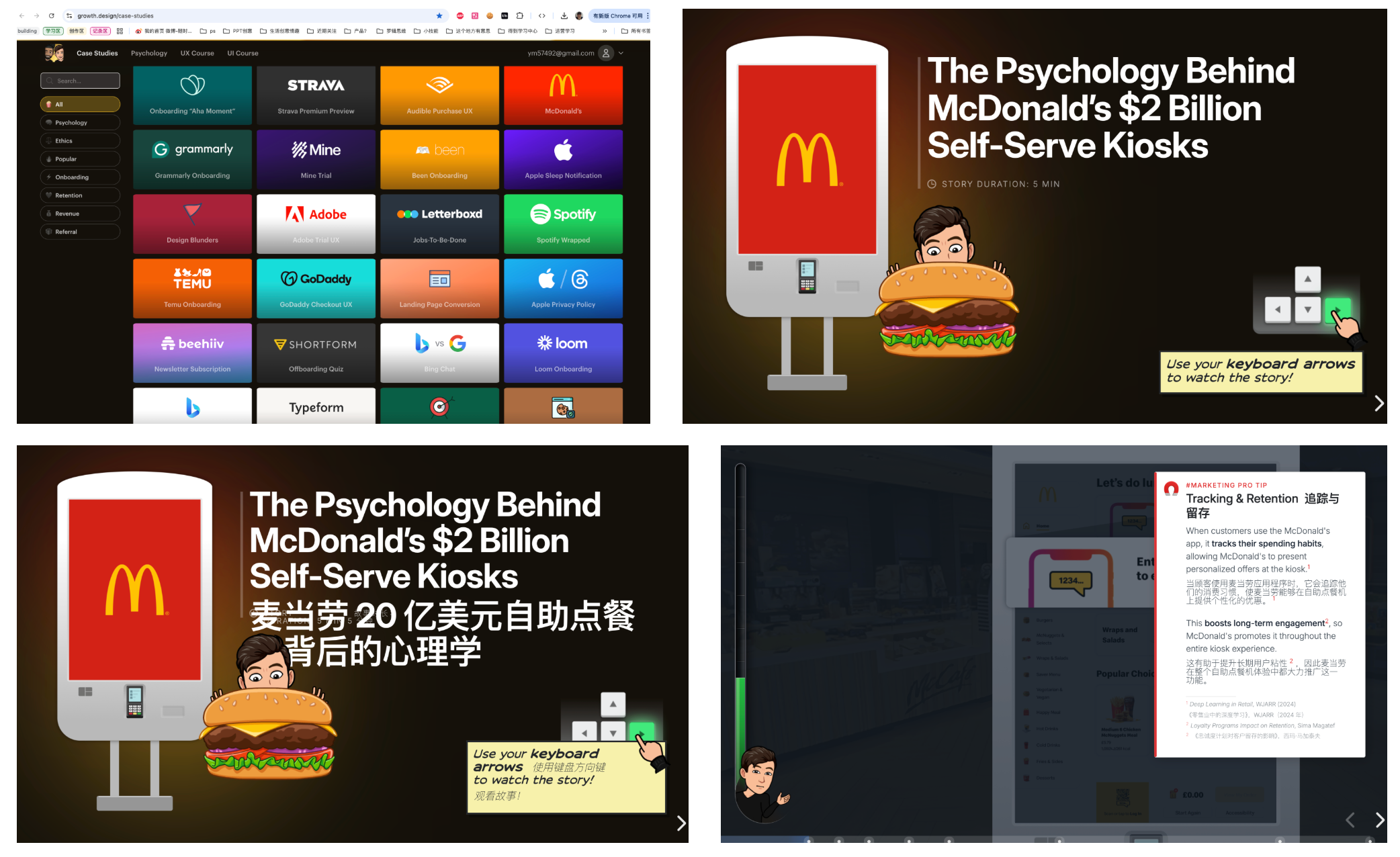 这个人太厉害了,他就是用讲故事加上产品页面的逐帧拆解和分析。