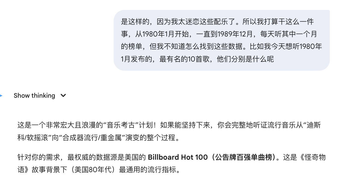 最开始,我的方法是,让AI每天给我推荐10首歌。从80年1月开始,告诉我当月的TOP10。