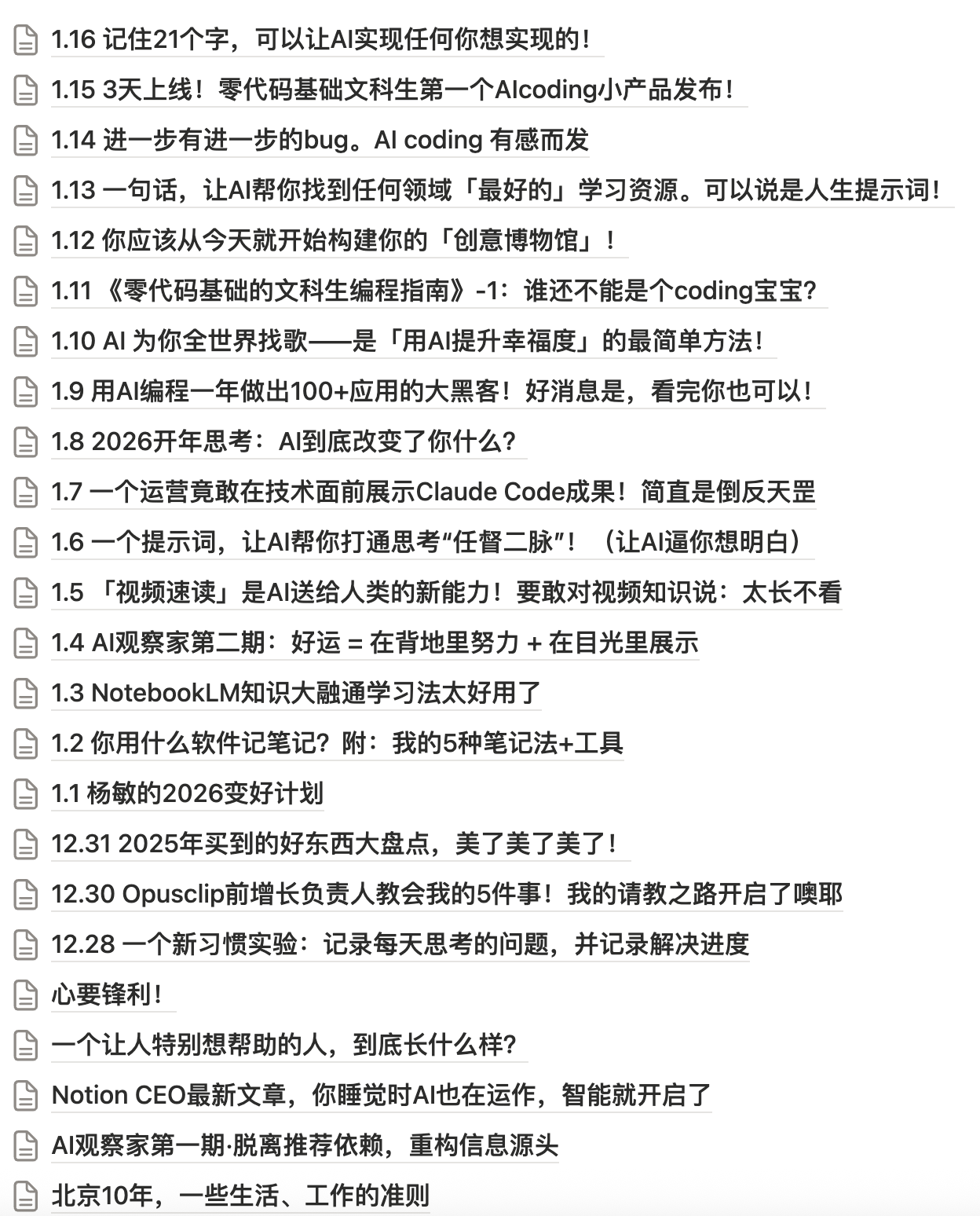 那不是巧了,我的文章全都更新在一个文件里,这是我当初给自己设定的15分钟写作实验文档。现在一篇需要花1个多小时了,但是,但是,但是,这是我的筑墙建楼项目呀,越积累越成长呀。