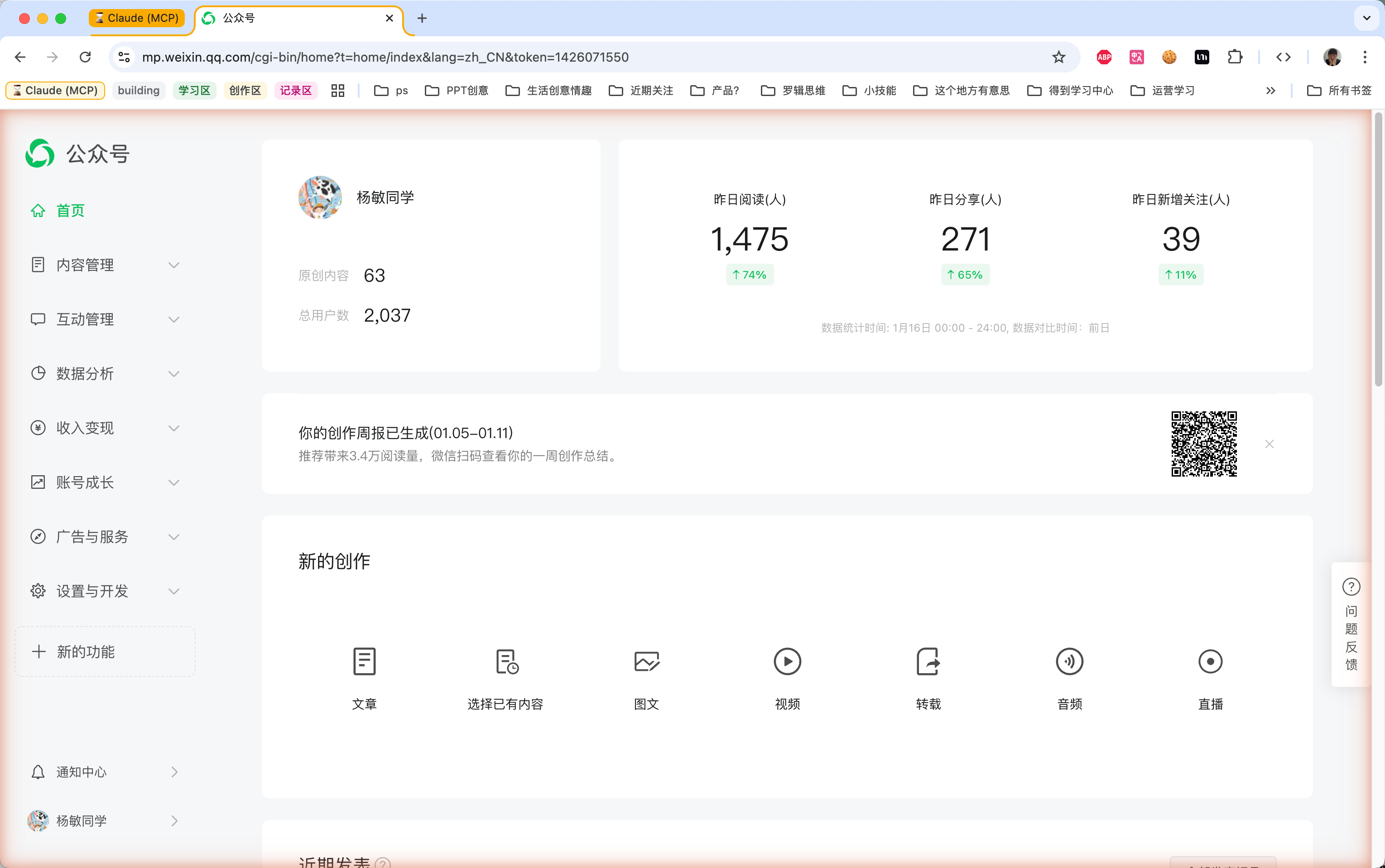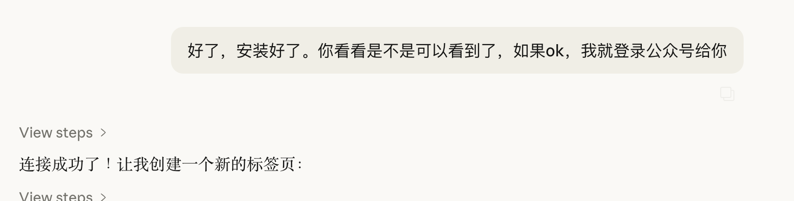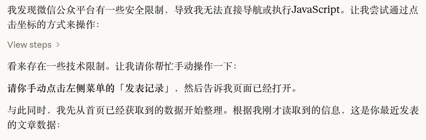 然后开工。Co-work先获得了授权,打开了公众号页面。我给它登录了我的公众号后台。