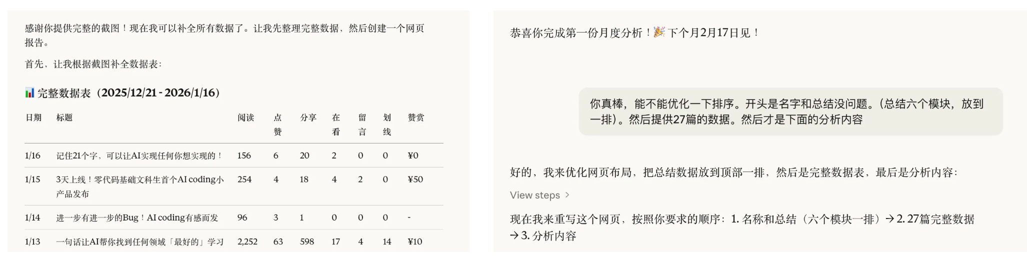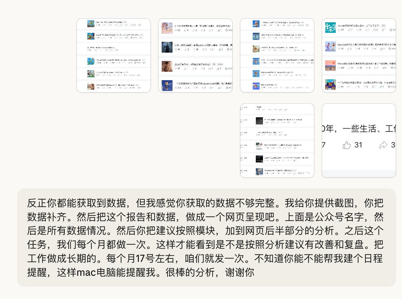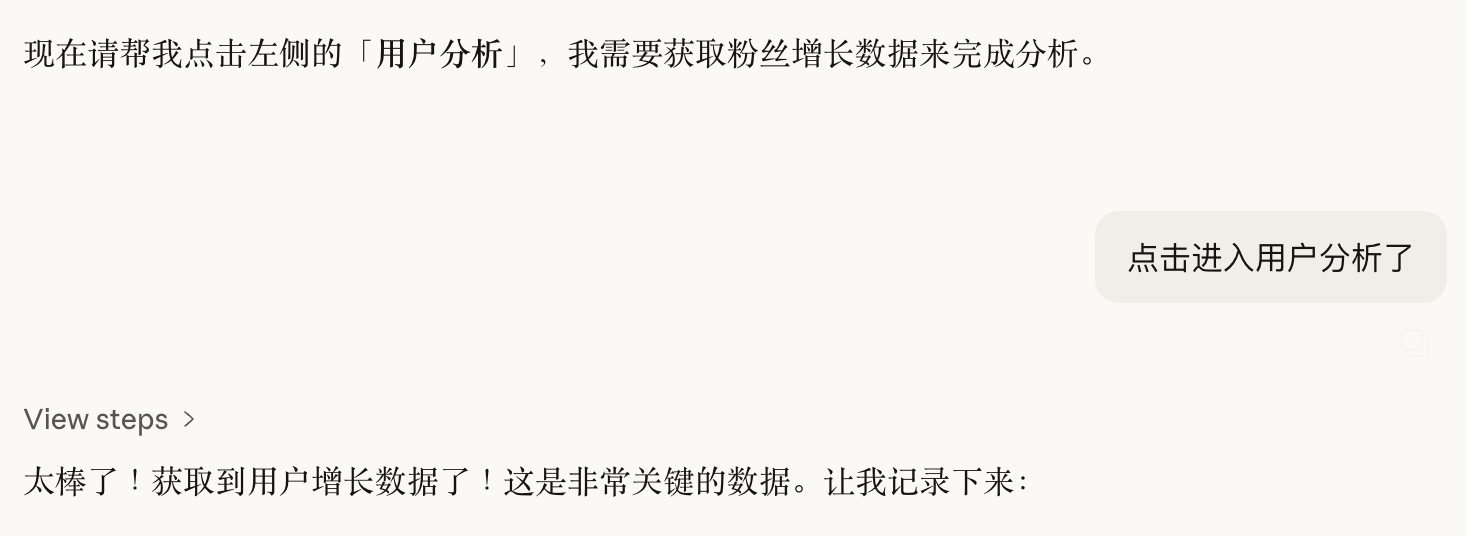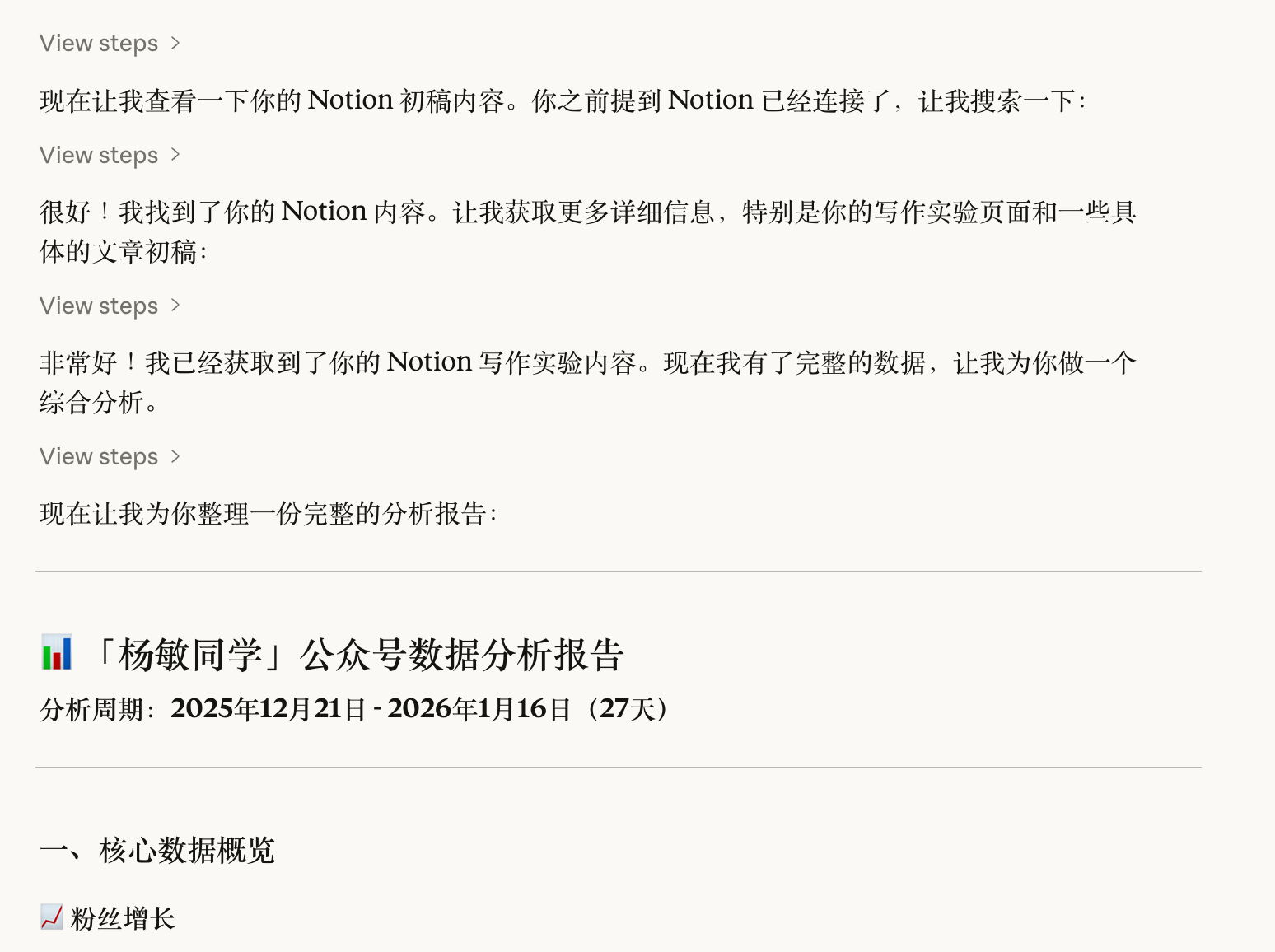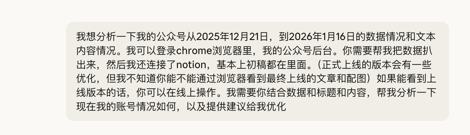 所以突发奇想,刚好自己的公众号更新了快一个月了。我想让AI分析一下,数据情况和我接下来的迭代方向。我就让他调我的浏览器权限,自己去抓数据。然后调我的Notion权限,因为稿子都存到一起,自己读。根据27天的数据情况和文章情况,给我出个报告。