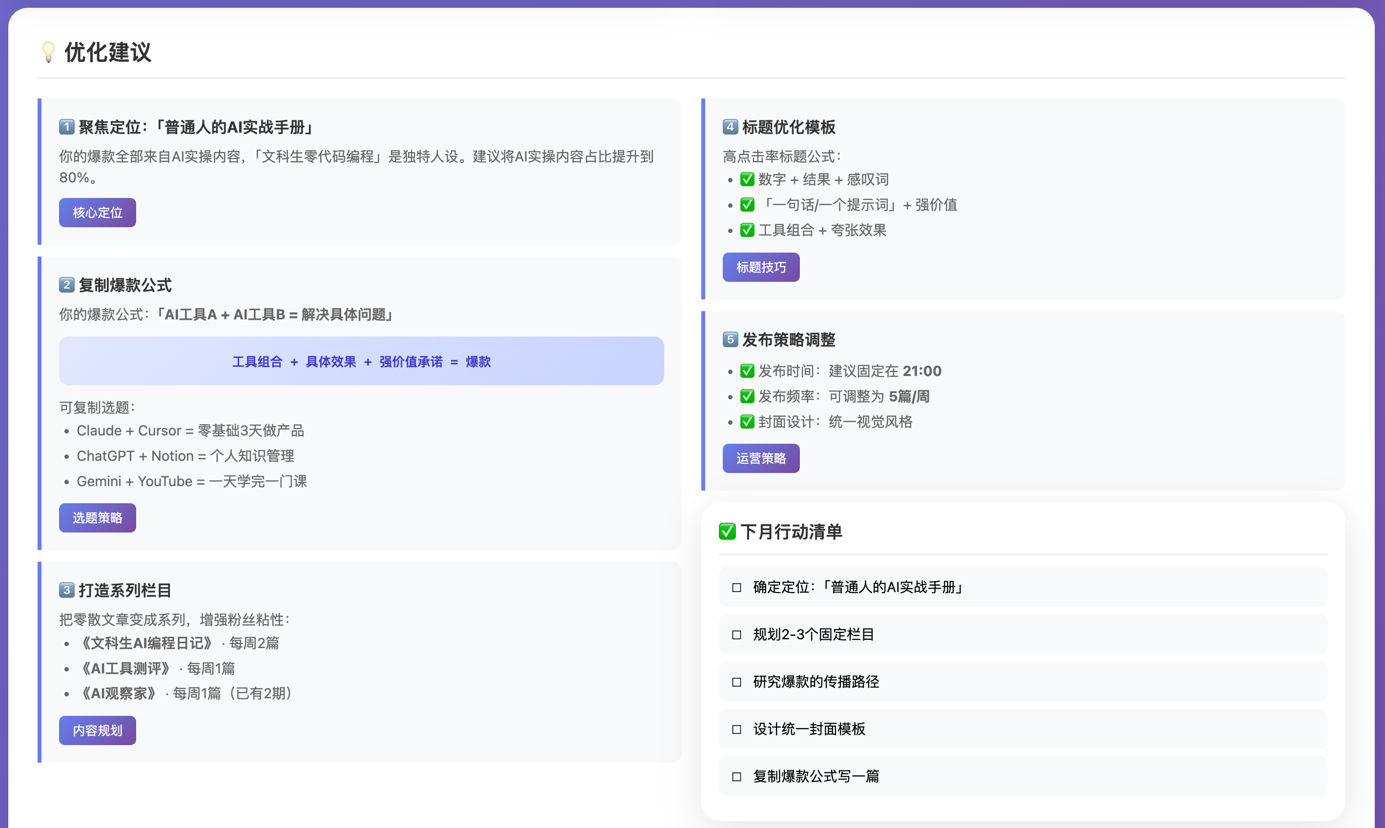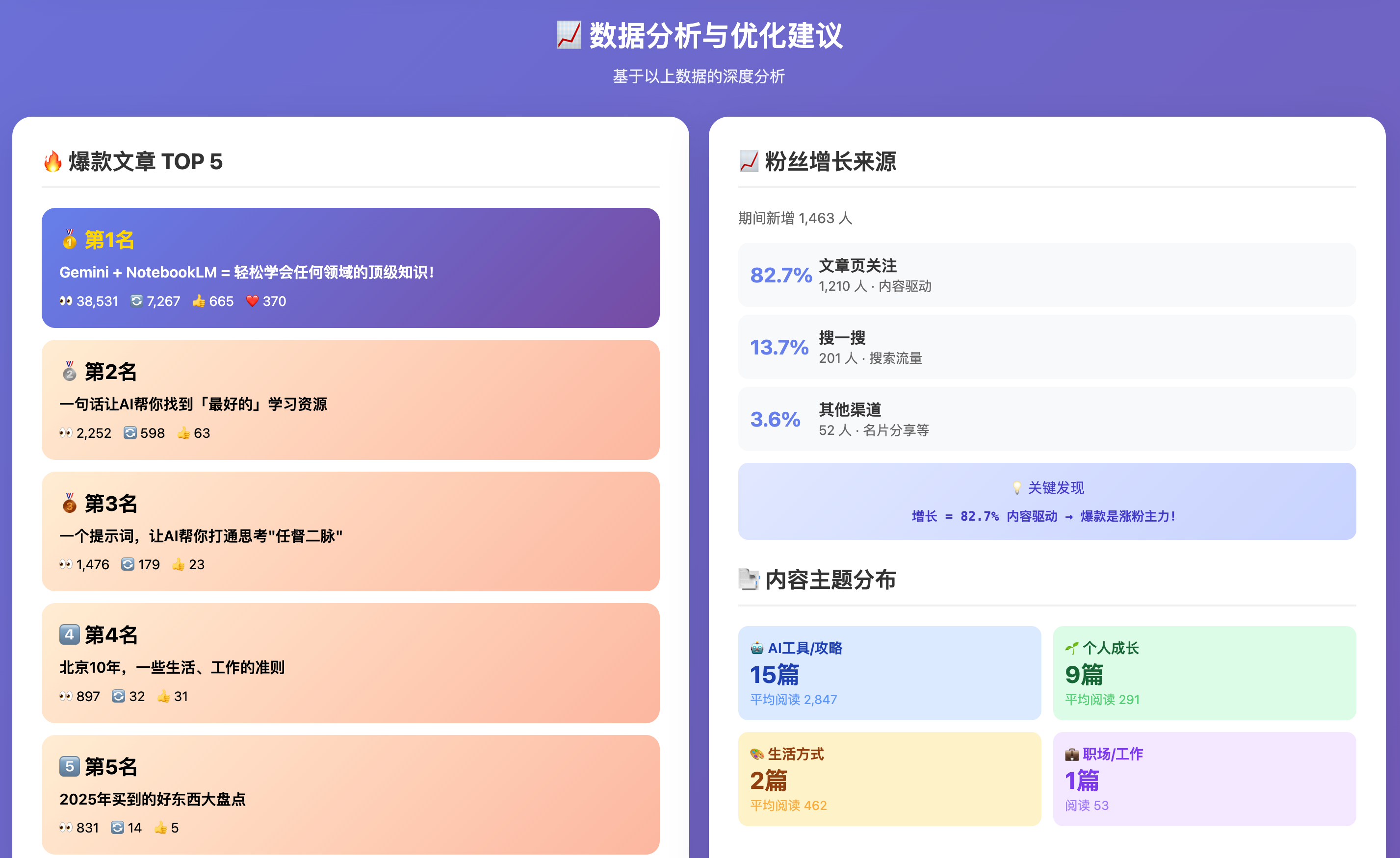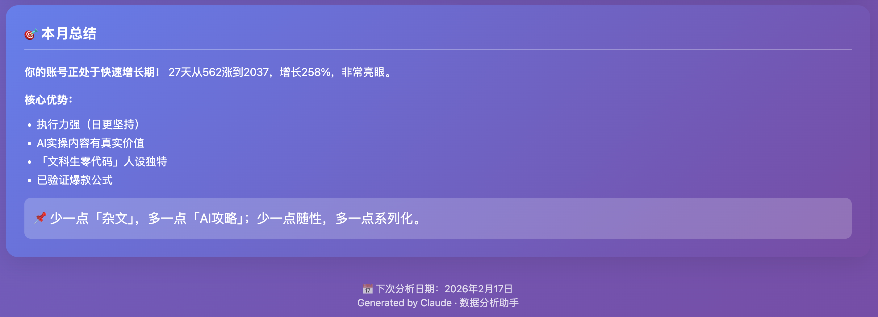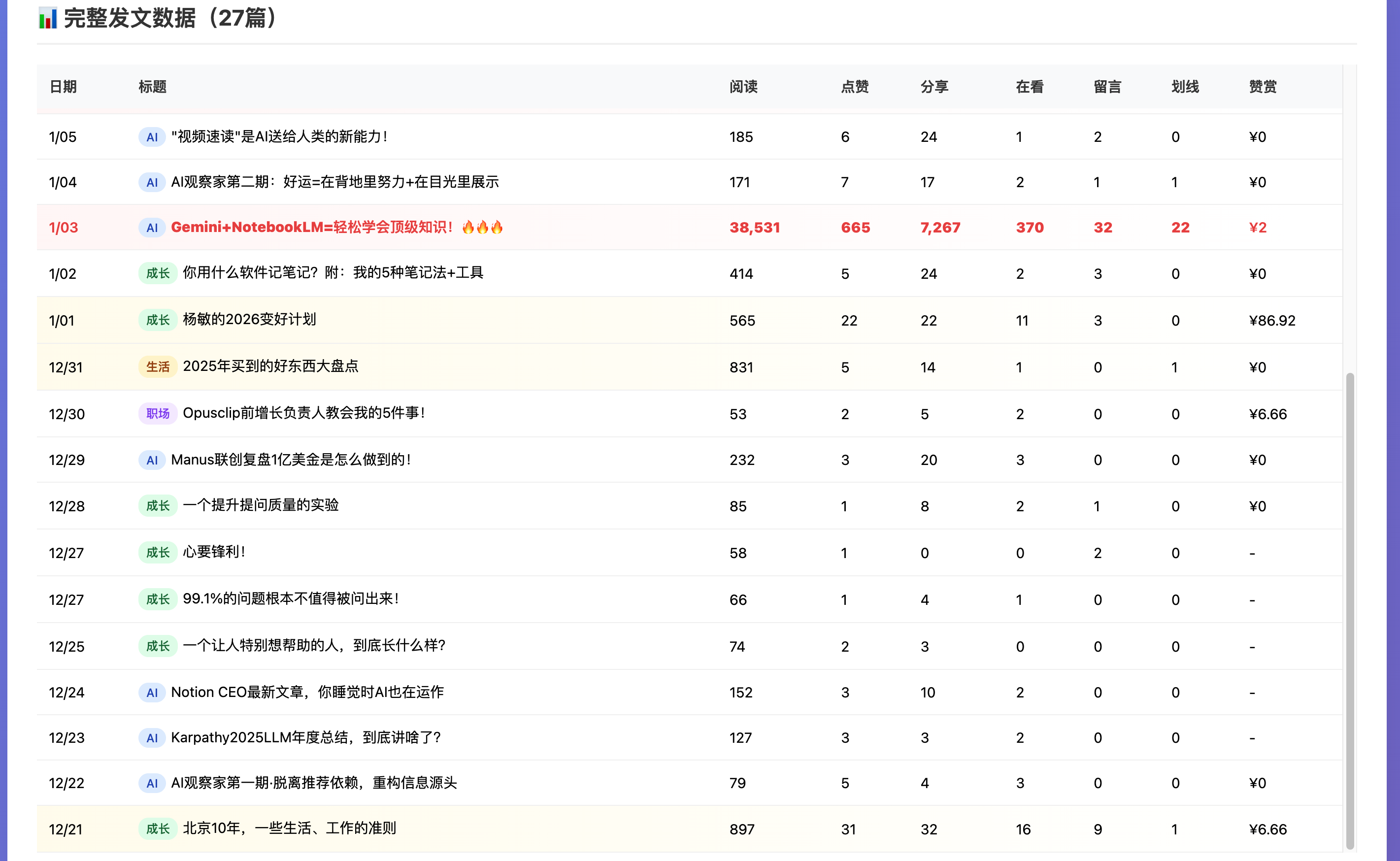 所以突发奇想,刚好自己的公众号更新了快一个月了。我想让AI分析一下,数据情况和我接下来的迭代方向。我就让他调我的浏览器权限,自己去抓数据。然后调我的Notion权限,因为稿子都存到一起,自己读。根据27天的数据情况和文章情况,给我出个报告。