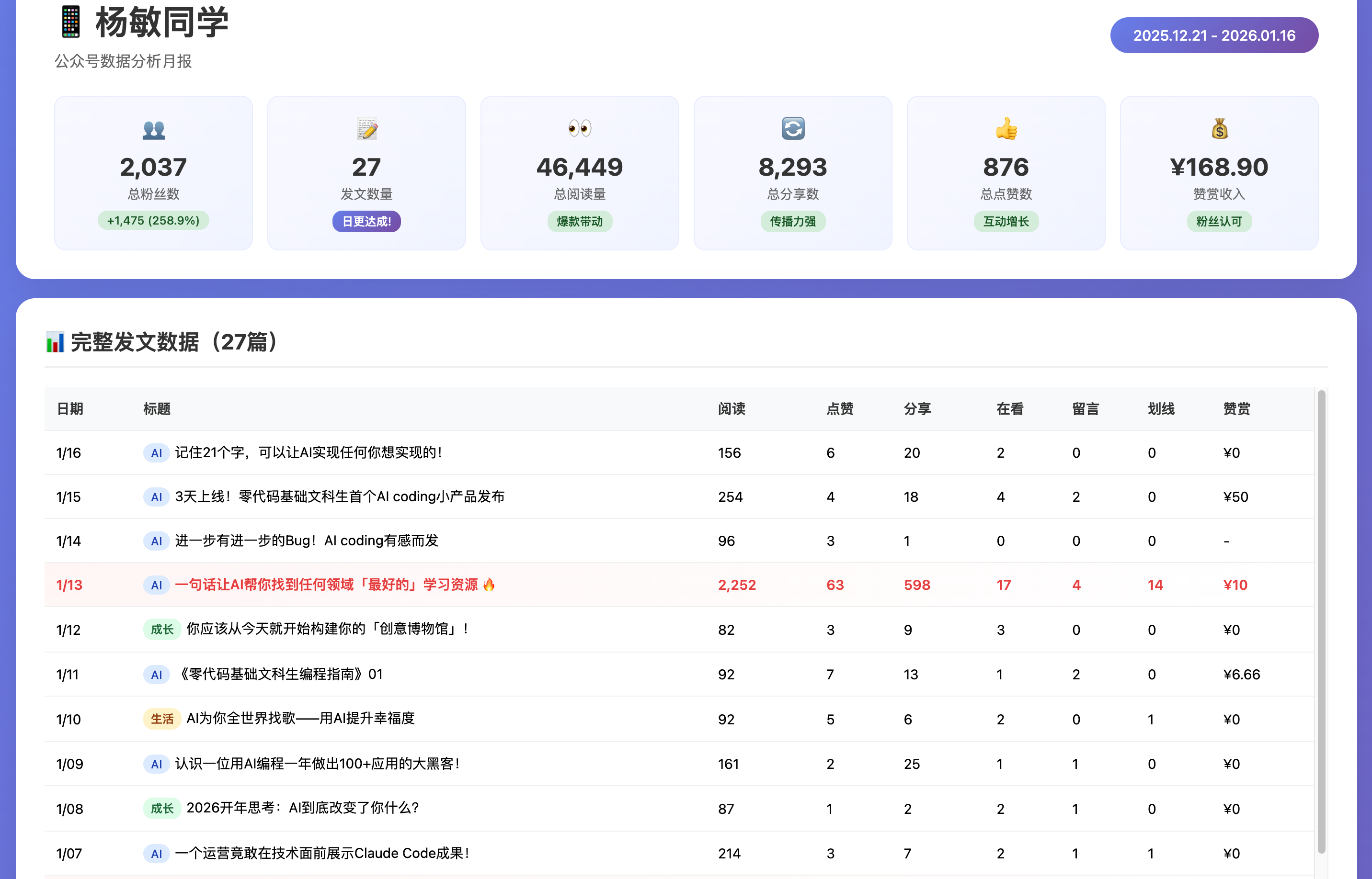 这一次我没在中途直接打断提醒。所以我自己又截图了一遍数据发给他补齐。然后让他给我生成网页报告。(这今天的文章不就能写了吗,完美呀哈哈哈哈哈)