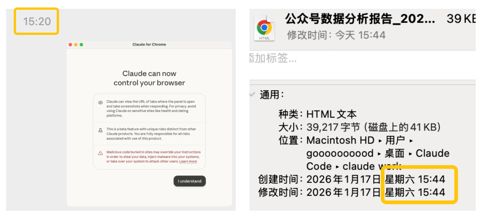 这个事情大概是下午3点左右开始的,中间有一些安装过程,大概3点20分,CO-work 控制了我的Chrome正式开始工作。最终报告产出时间是3点44分。也就是说,这份报告它只花了24分钟。