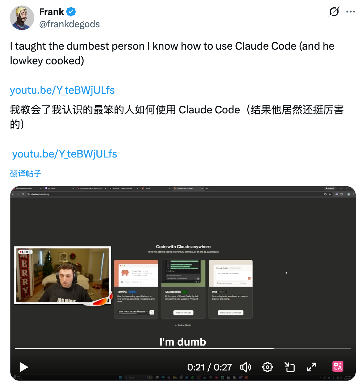 博主Frank也很坏,起了个好标题:我教会了我认识的最笨的人如何使用Claude Code(结果他还挺厉害)