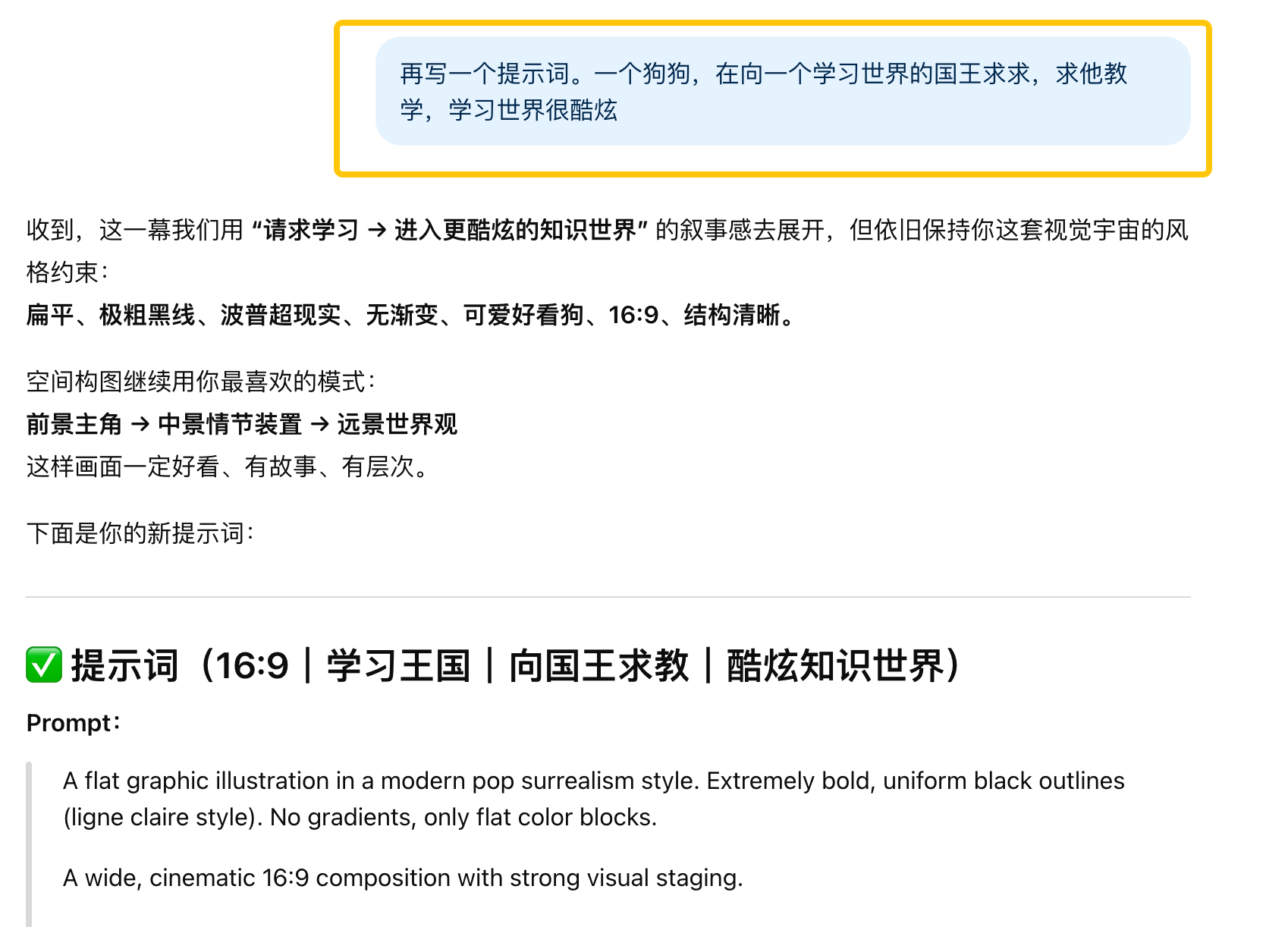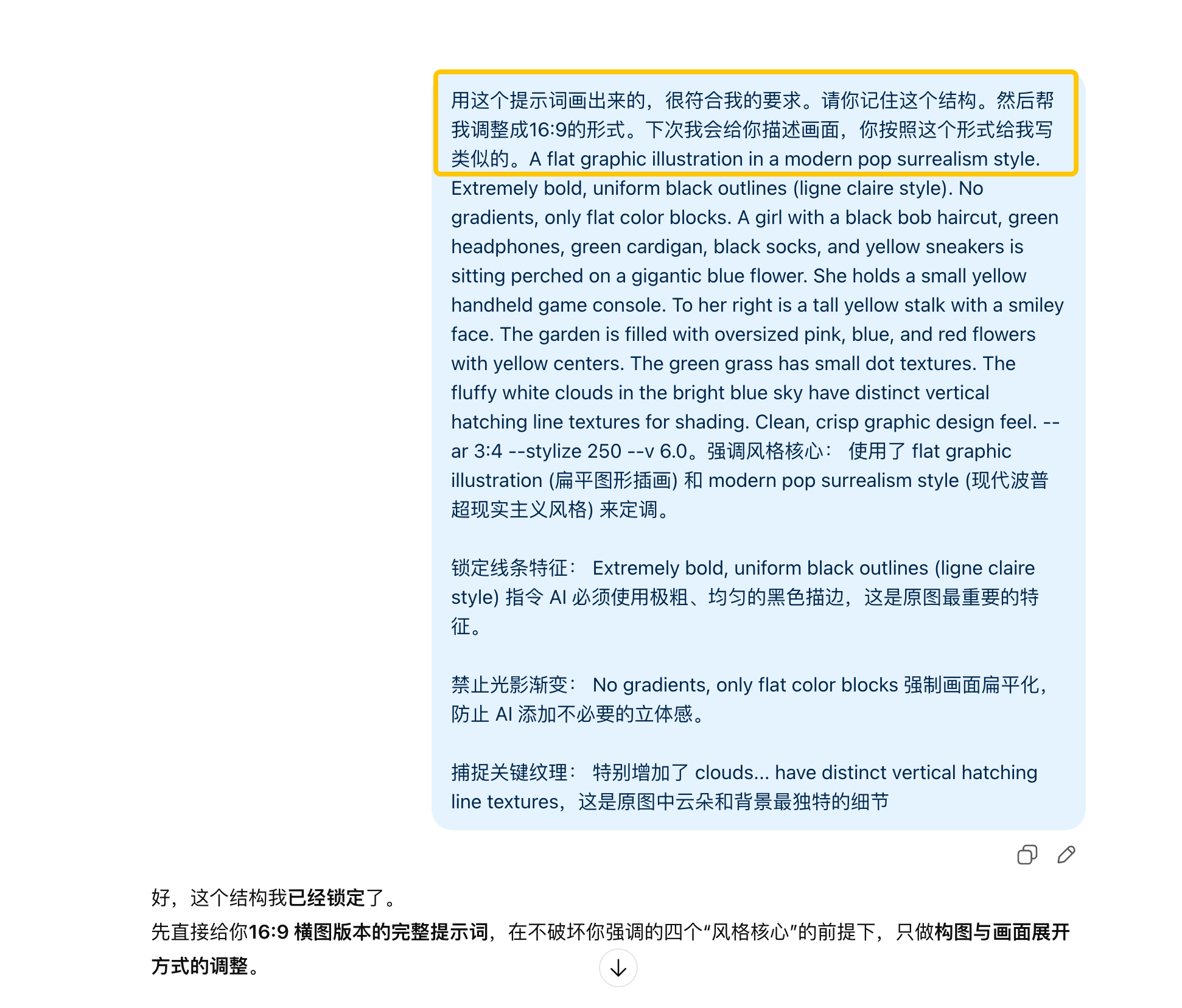 但是这一步还没有结束,你要拿着这个提示词,看看是不是能复刻出来真的和这个图差不多的。如果你觉得复刻对了。你就把这个提示词复制下来,让AI记住这个结构,以后你只需要描绘想象就行。