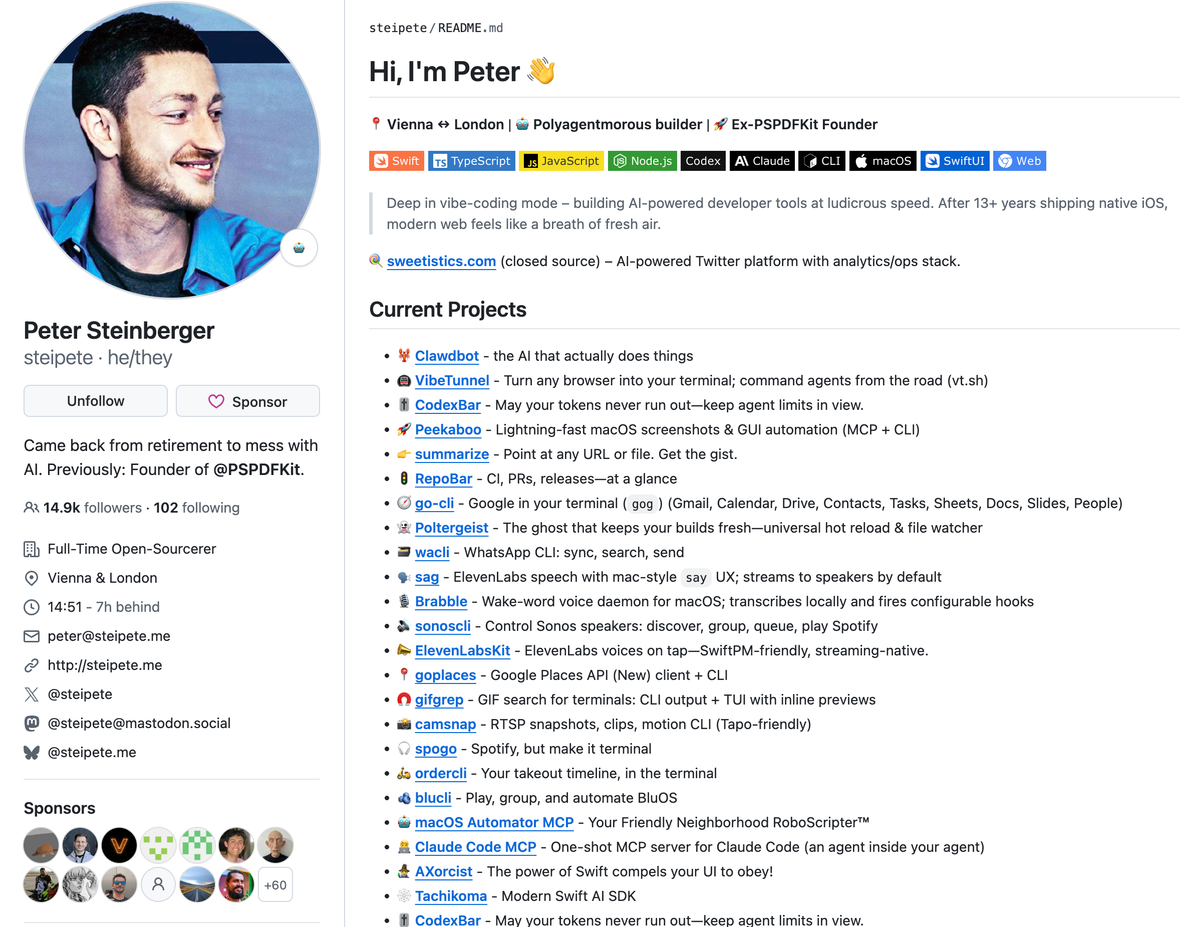 Clawdbot只是其中之一。往下翻,他还做过管理API使用的vibemeter,让AI发推特的终端命令行,连sonos音响的终端控制器等等。