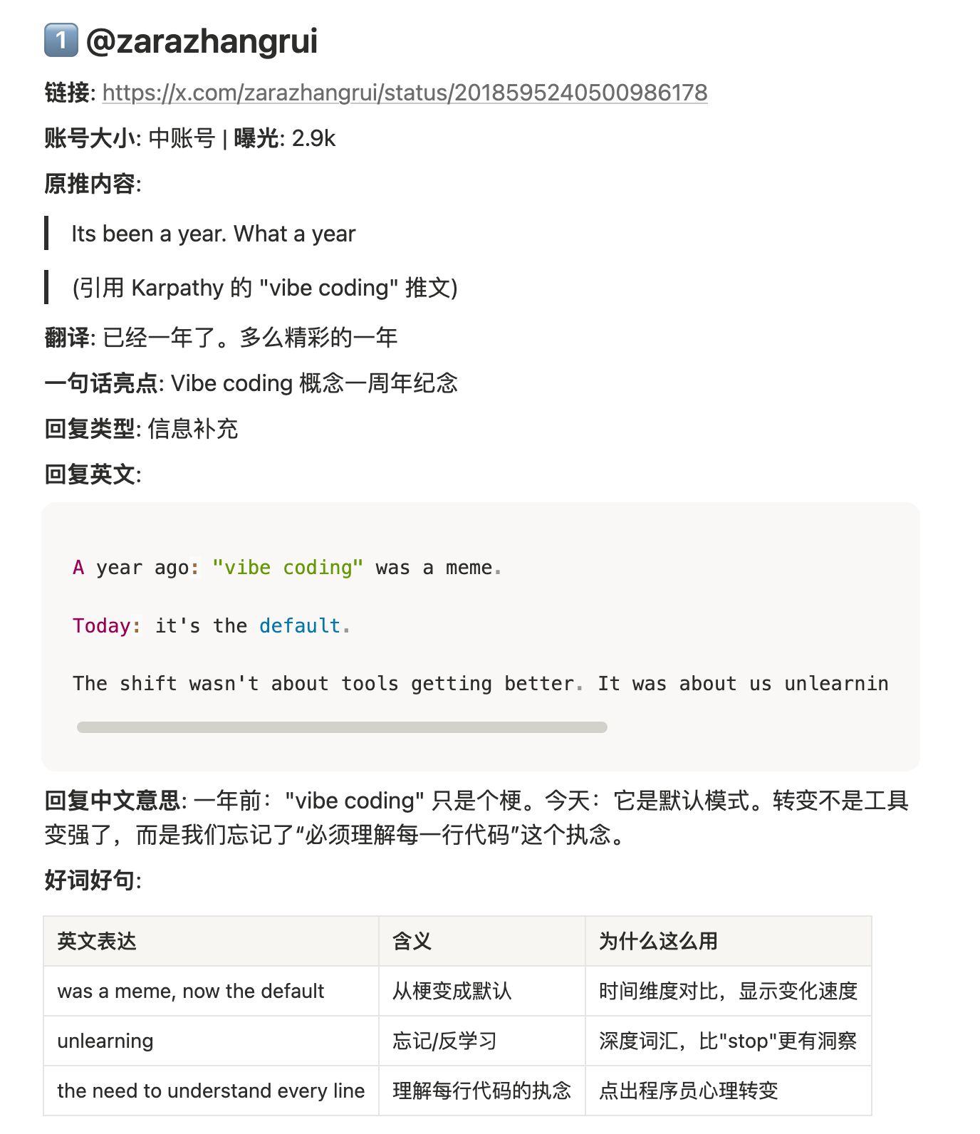 | 个人喜欢的回复 | 10% | A+B=新东西、逻辑链(X→Y→Z)、清单补充 |