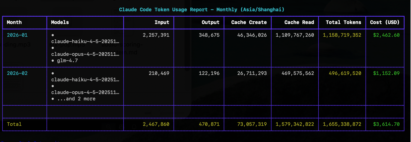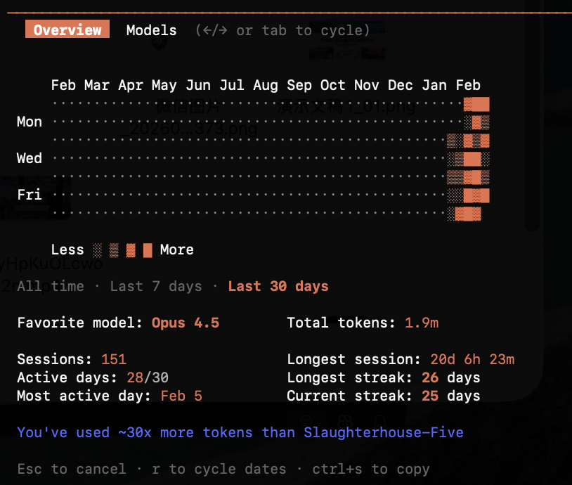 2月6日,一个月过去了,从Claude 的记录里看到,用了16亿的token。Claude有一个指令「insights」,他会统计一个月的工作数据。中间有个数字很好玩,过去这个月,换算成AI的工作时间,是10827小时。这个时间,我猜测是人类如果要完成这些事情的换算时间。